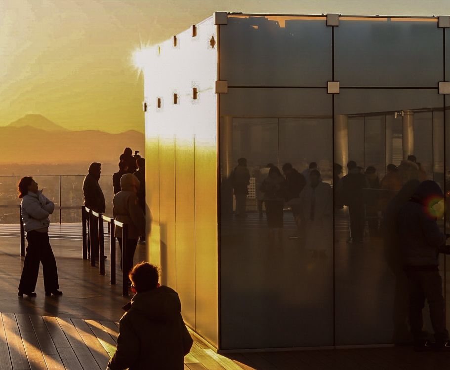 A child runs excitedly towards the setting sun on the Shibuya Sky observation deck in Tokyo. The warm golden light floods the scene, casting long shadows and reflecting off the glass walls, while distant mountains loom on the horizon.
