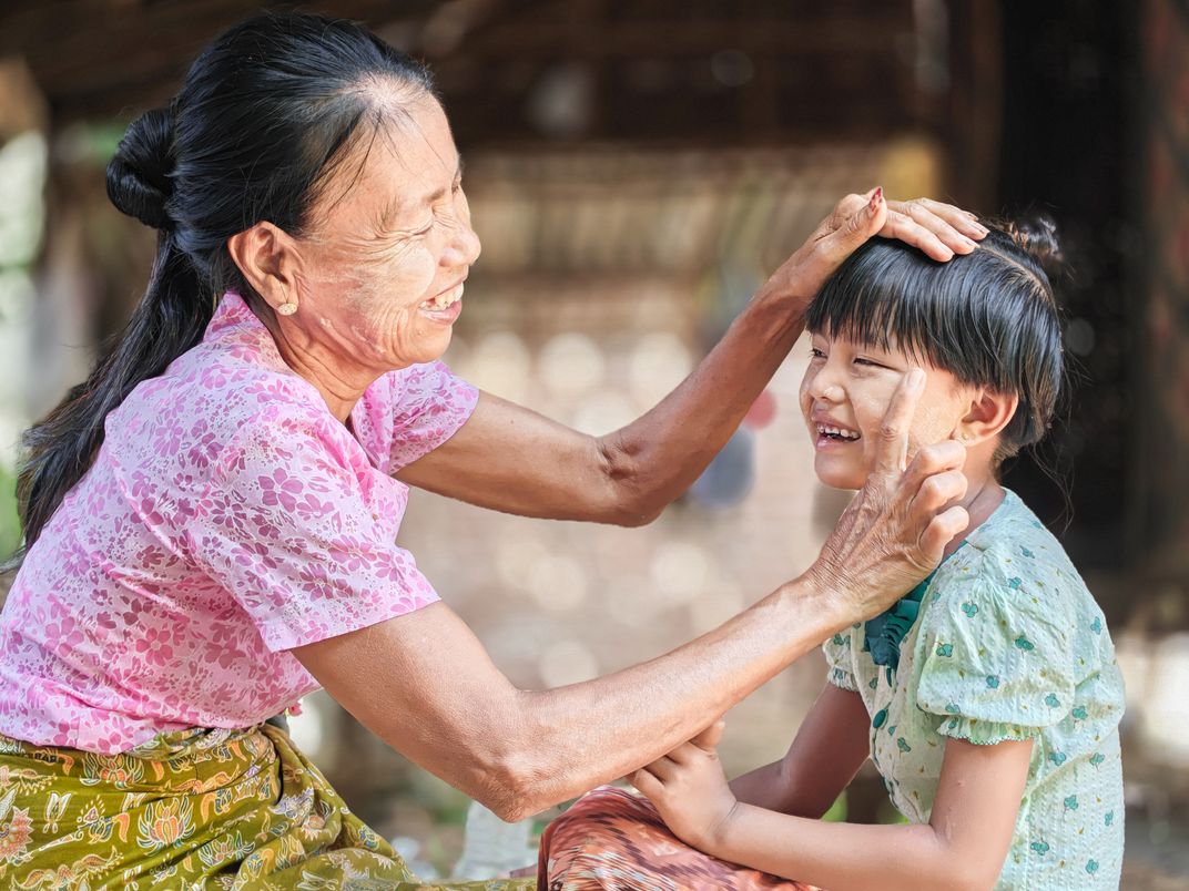 In this heartwarming moment, a grandmother gently applies thanaka to her granddaughter’s face, her eyes full of love and care. The child gazes up with a bright smile, feeling the warmth of affection and tradition passed down through generations. This simple act beautifully reflects the bond between family, culture, and everyday life in Myanmar.