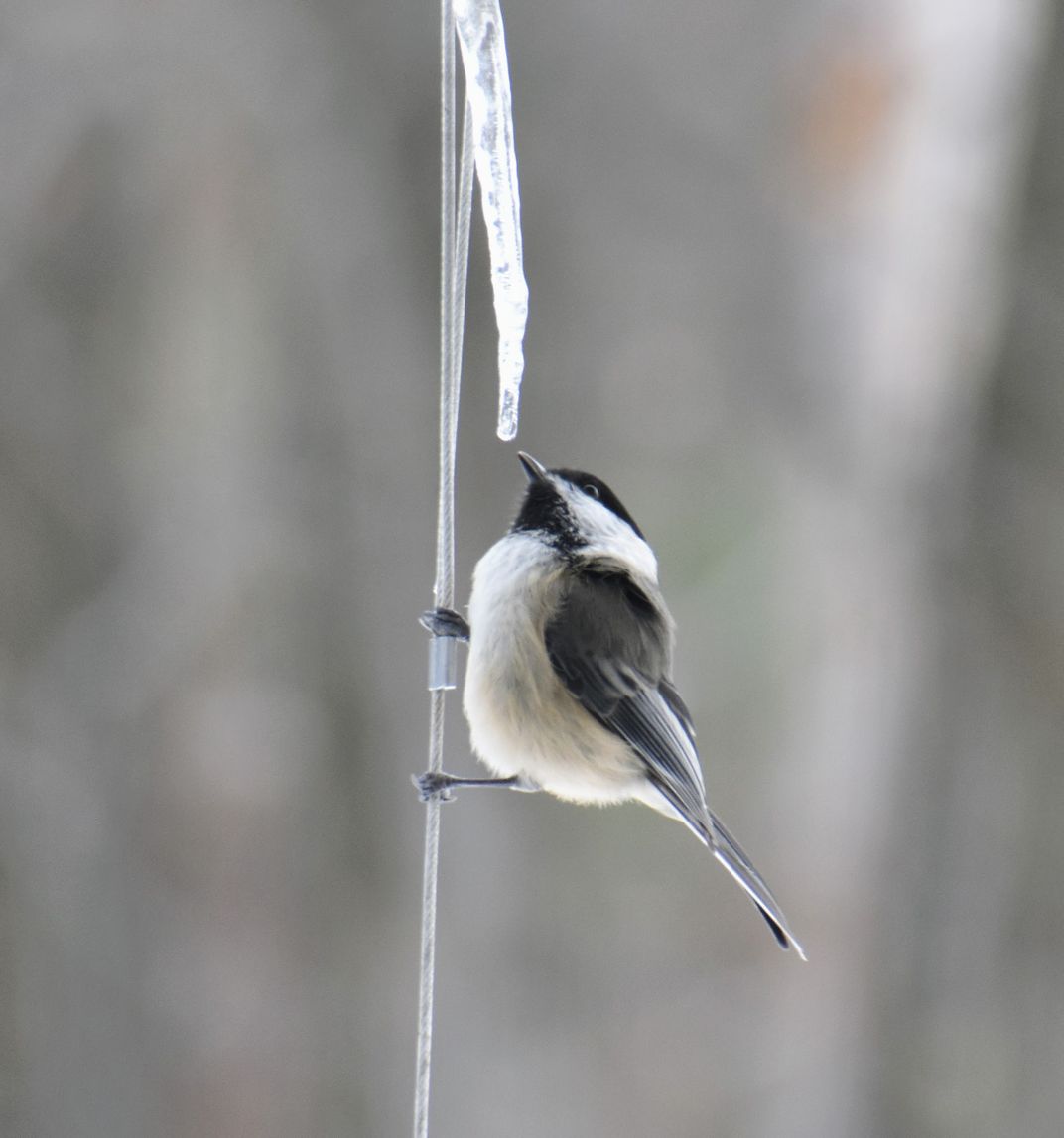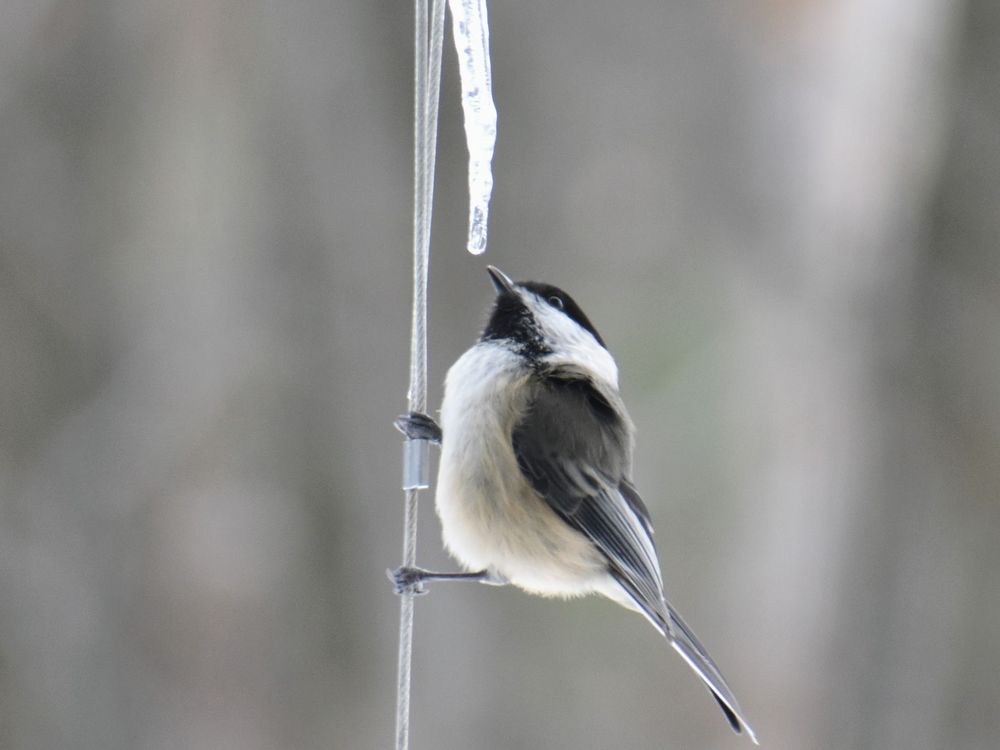 This chickadee is hanging onto the wire holding a feeder. It is more interested in the icicle than the bird seed!