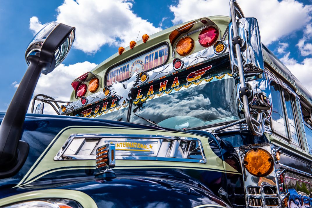 One of the colorful myriad of converted American school buses that carry people all over Guatemala.