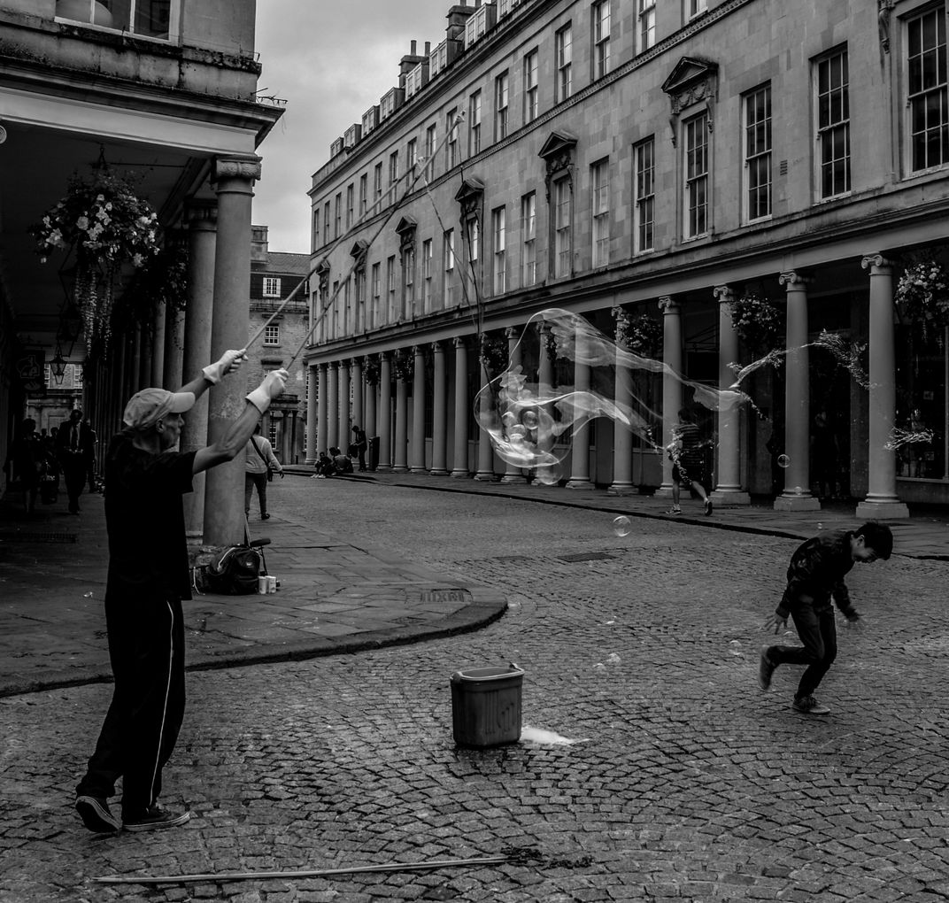 Street Performer on the cobblestone streets of Bath, England creating large bubbles making a child's day