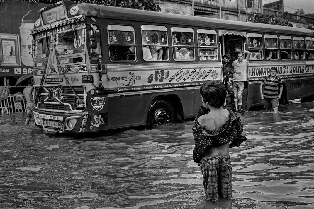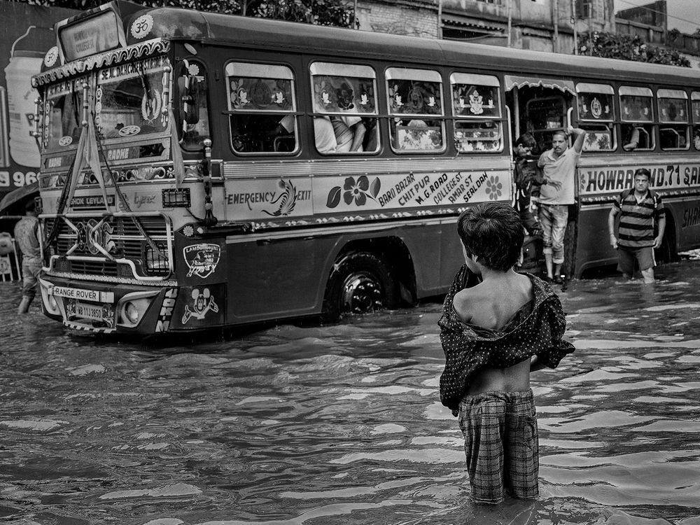 Context of the Deluge: "Deluge" is an evocative word, often used in a biblical sense for a catastrophic flood. In the context of Kolkata, it refers to the annual, debilitating floods that follow the intense monsoon rains. These floods expose the city's inadequate drainage system and the resulting difficulty of life for its residents, particularly the most vulnerable. The Child's Perspective: The child's posture—facing away and slightly bowed—creates a profound sense of isolation and resilience. He is literally a "child of the deluge," one who has grown up accustomed to this extreme environment. The act of pulling on his shirt suggests he is either wading out of the water after some activity or is simply preparing for his day in this unusual, waterlogged world. His solitude against the backdrop of the massive, struggling bus highlights the disproportionate impact of such environmental events on children. Artistic Merit: The photo is highly regarded for its composition, human element, and social commentary. It's a striking piece of photojournalism that manages to be both documentary (showing a real flood) and artistic (conveying emotion and atmosphere). It transforms a common event (monsoon flooding) into a powerful, universal symbol of endurance and the challenges faced by the urban poor in the face of climate or seasonal adversity.