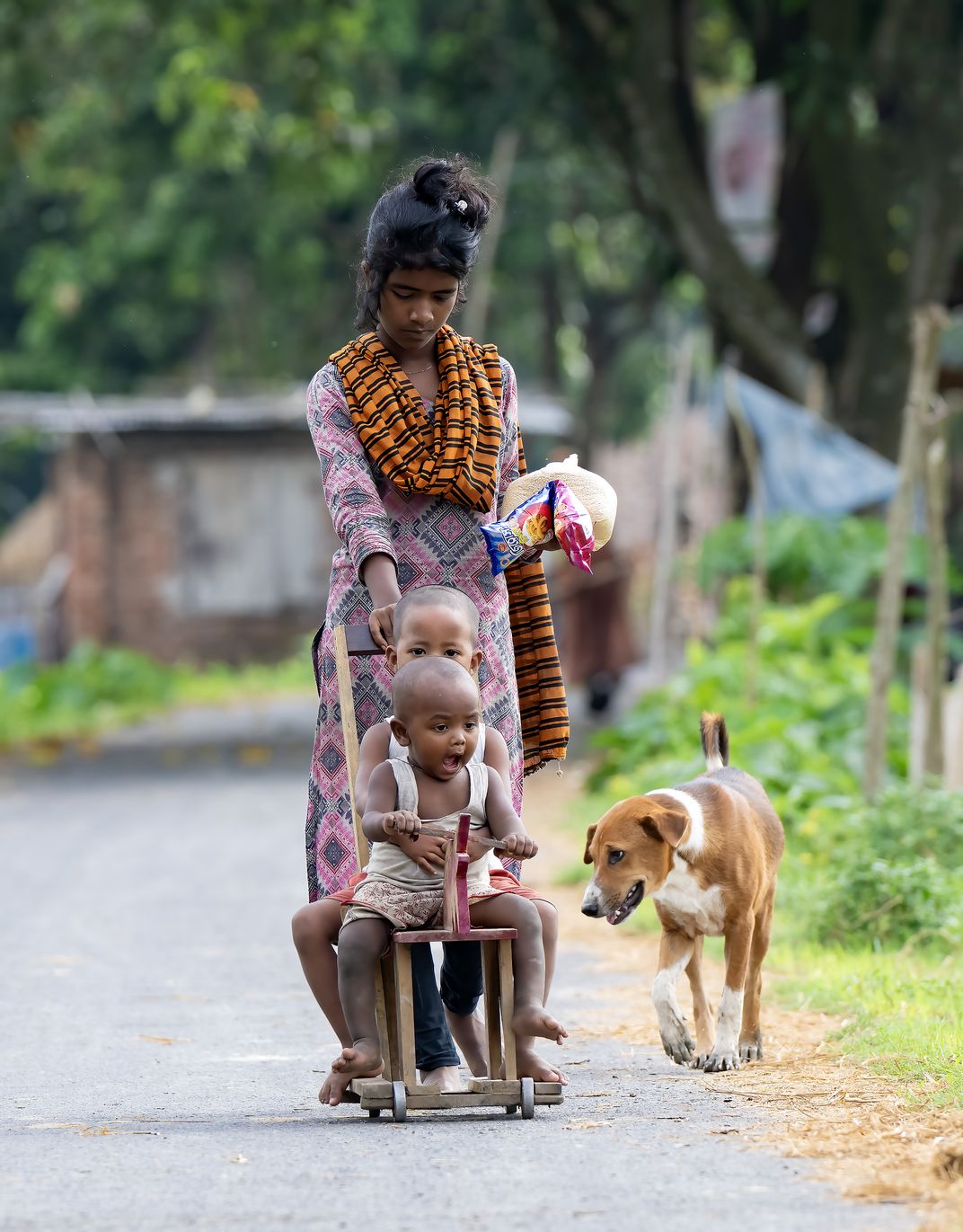 A girl with her two brothers was pulling a toy car while their pet dog with them