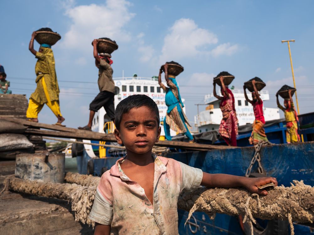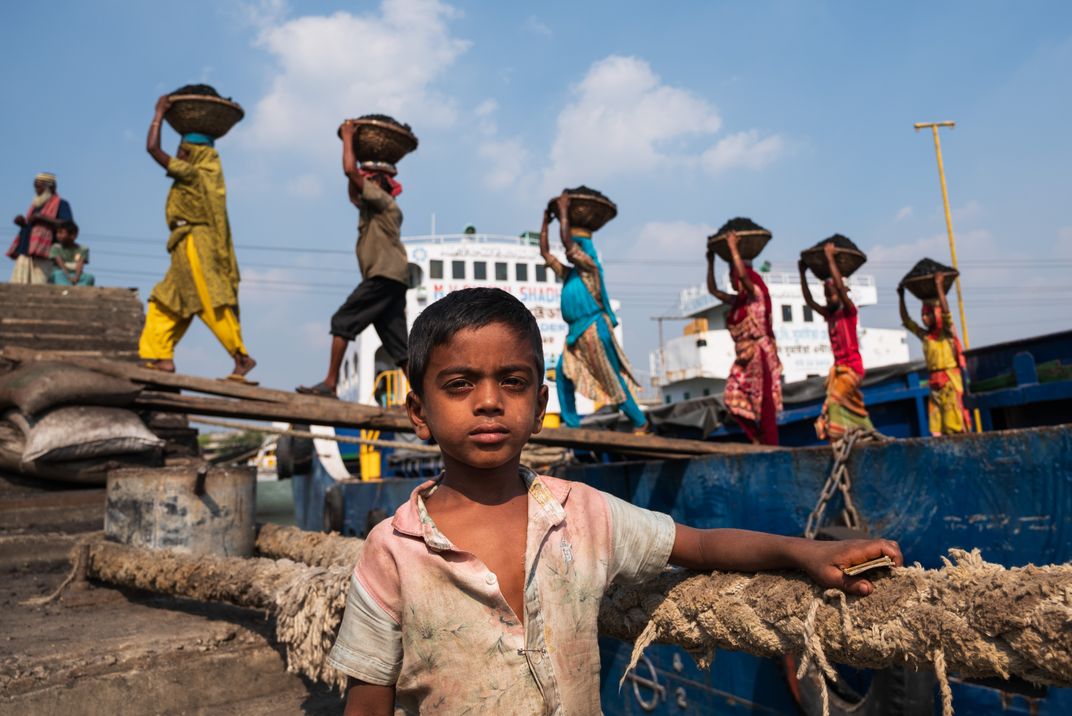 In Gabtoli, a young boy stands near the coal unloading zone as his mother works behind him. Migrant workers toil long hours for minimal pay, and his presence here reflects a childhood shaped by hardship instead of school and play.