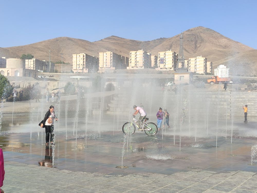 In the heat of summer, children were cooling themselves and playing in the water with the park's water fountains on.