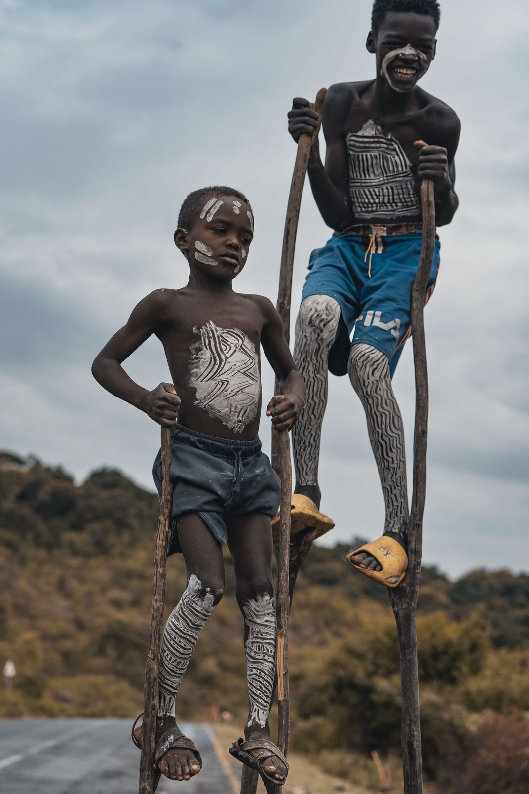 Along a roadside in rural Africa, boys walk on tall wooden stilts, their bodies painted with bold patterns. The smallest among them balances carefully beside the older kids, capturing the spirited energy and cultural expression of this landscape.