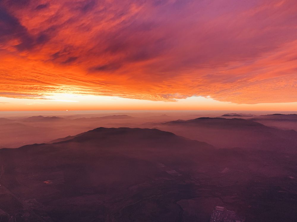 As the plane broke through the clouds on approach into Santiago Chile, the sunset exploded. The mist and hills created a stunning forground