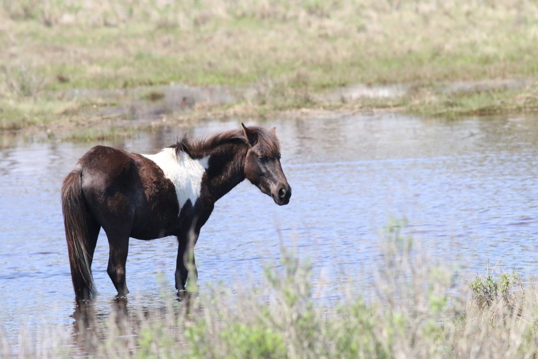 This photo is of a wild Chincoteague Pony standing in the marsh at Assateague Island National Seashore.