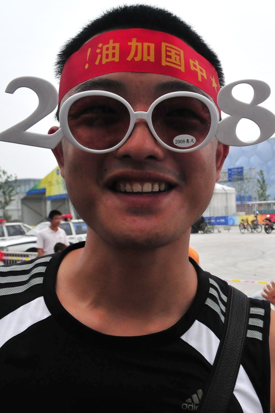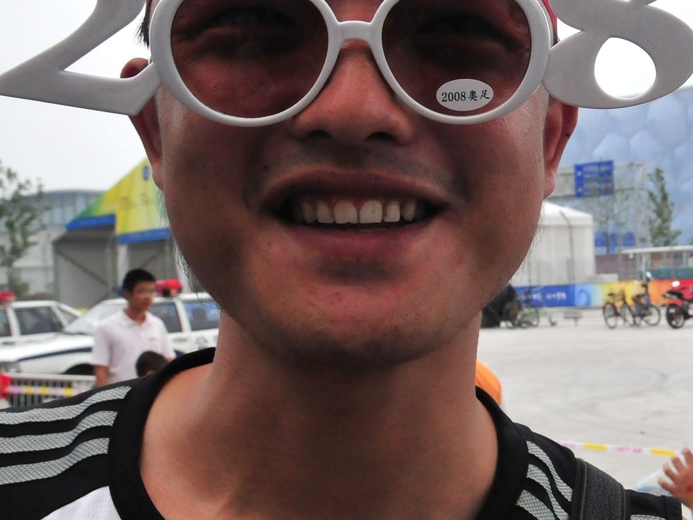 Chinese Olympic tourist outside 'Water Bubble' swimming and diving stadium.