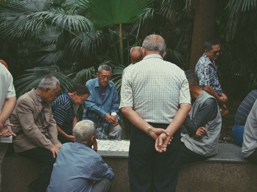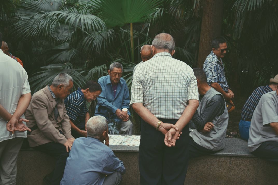 Elderly Chinese citizens playing mahjong in Chengdu's People's Park. On a peaceful Saturday, many Chinese often gather to play leisurely games and drink tea.