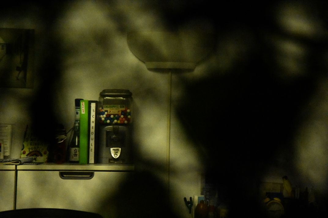 A gumball machine bookends binders behind a dentist’s window in Los Angeles.