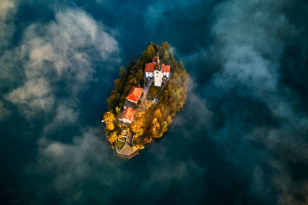 The Church of the Mother of God on Lake Bled. Amid the soft morning mist, the famous Church of the Assumption rises gracefully from the water of Lake Bled in Slovenia. The mist covers the surface of the lake, adding an ethereal quality to the scene, while the calmness of the lake reflects the tranquil atmosphere. The photograph captures a moment of tranquillity, where nature and history are seamlessly intertwined, and offers a glimpse into the timeless beauty of one of Slovenia's most popular landmarks.