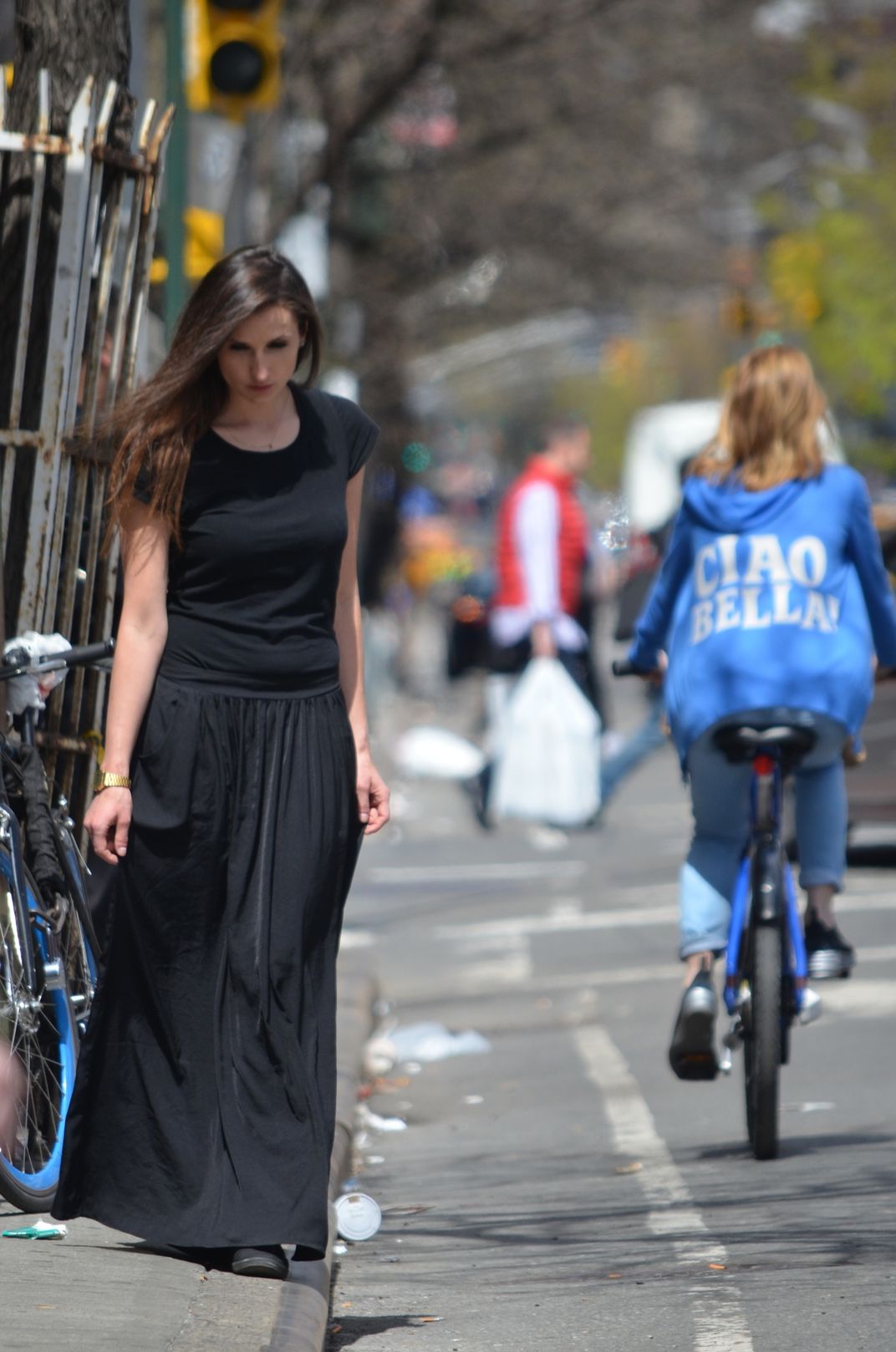 This photo was taken at the intersection of Manhattan. A woman trespassing while another riding a bike.