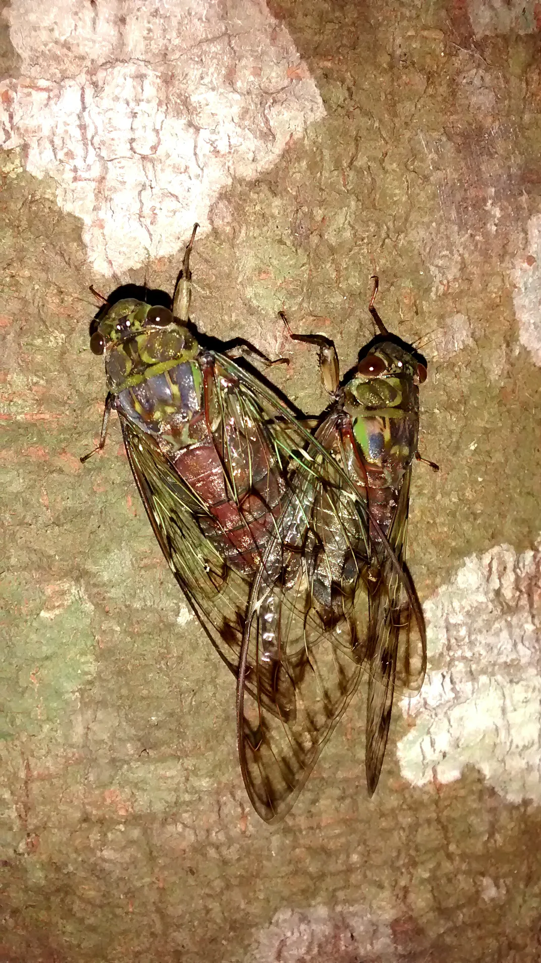 Male and female cicada mating on the trunk of a jack fruit tree.