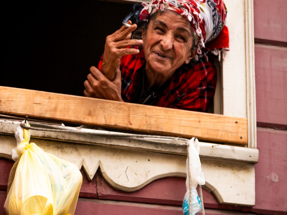 An elderly woman leans out of her wooden house in Istanbul, cigarette in hand, exchanging a joke with someone on the street. The improvised pulley of plastic bags reveals her daily routine, turning a simple smoke break into a small chronicle of humour and resilience.