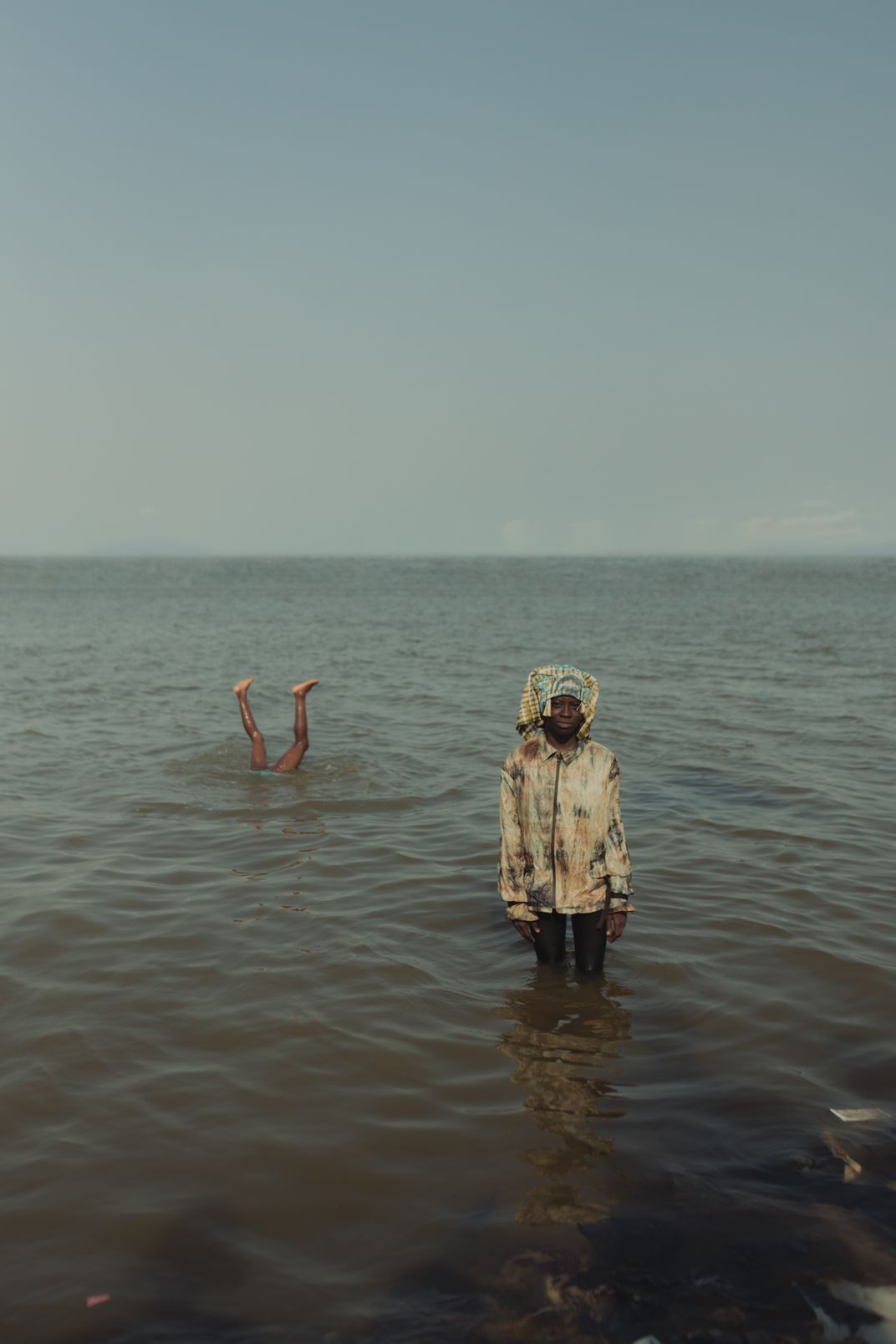 Nífèémi Okùn-Omo stands in water of the location with oneof the children of Bariga playing. The idea is to portray the local Nigerian teenagers from the seaside of Isale Akoka area in Bariga, Lagos as key players into closing the loop of the circular economy. Bariga lies a picturesque island renowned for its bouncing soil, aquatic activities, and floating homes. This unique habitat was crafted by breathing new life into materials around them and that mostly come through the lagoon - waste, objects, planks, textiles, plastic, and more - transformed into practical uses like landfilling, building materials, electronic repairs, and even musical instruments and fashion through innovative recycling and upcycling ideas. Unbeknownst to many, these efforts contribute significantly to the global economy.