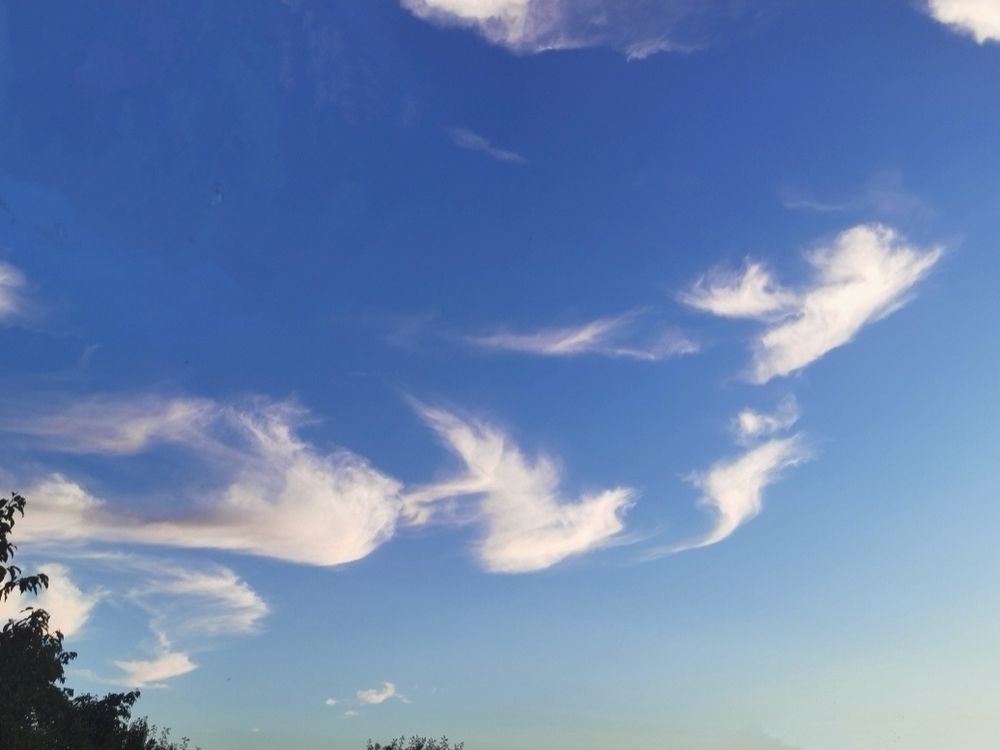 Egy tiszta nyári napon örökítettem meg ezeket a szálkás, pehelyszerű Cirrus felhőket, amelyek az ég boltozatán úsznak. A felhők formája, mintha galambok vagy tollak röpülnének szét a mélykék vásznon, a könnyedség és a szabadság érzetét adja. A fák finom sziluettje lent a kép alján ad mélységet és egy földi viszonyítási pontot az égi tánchoz."