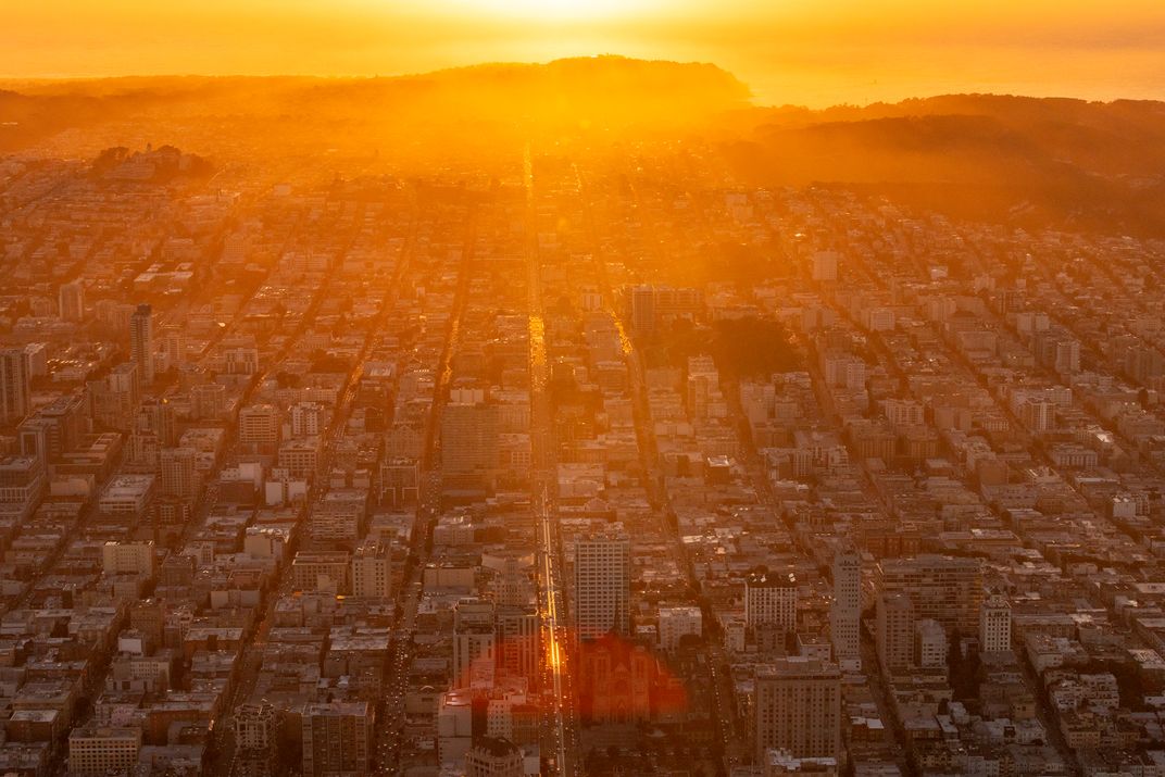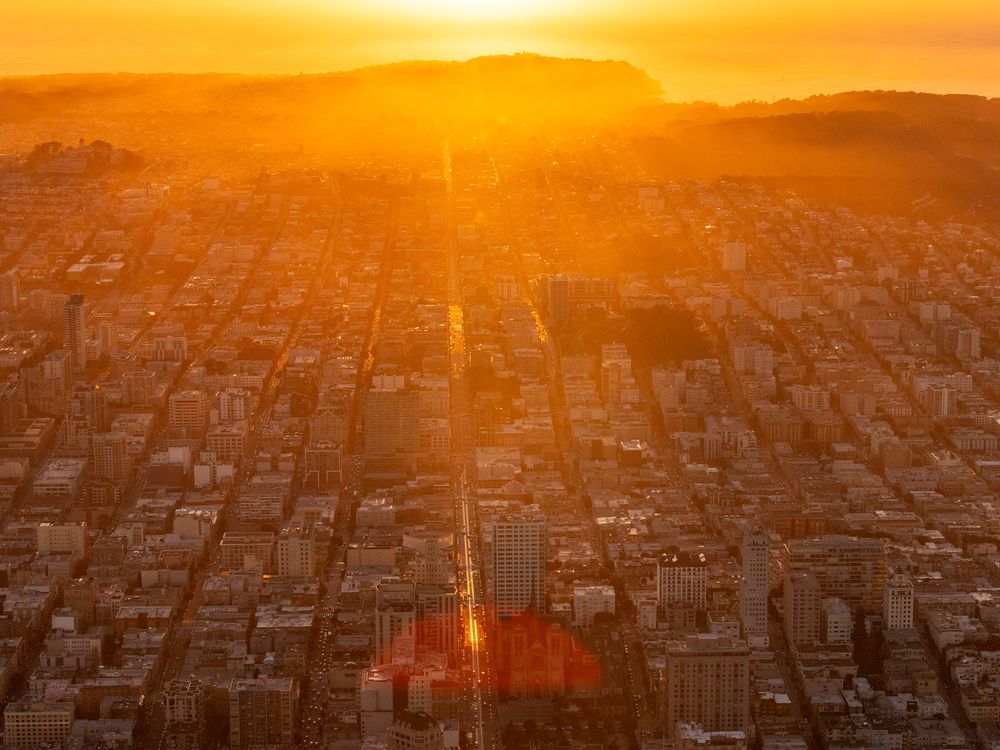 At sunset, a straight avenue in San Francisco lines up with the sinking sun, turning the street tracks into a bright line that runs from downtown toward the Pacific. Photographed from a small aircraft, the view shows the city’s grid fading into hills and ocean at the edge of the continent.
