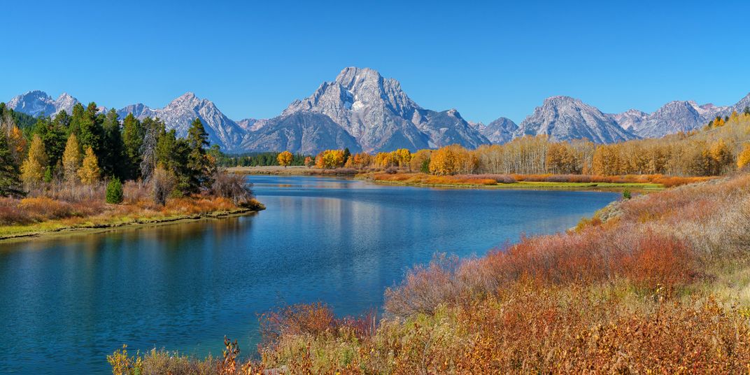 The late-autumn colors of Grand Teton National Park are on full display in this image I captured on a crisp, clear October morning. The vantage point is the Oxbow Bend section of the Snake River which provides a wonderful setting to follow the path of the river along its aspen-lined shores as it winds its way through the base of the Grand Teton Mountain Range.