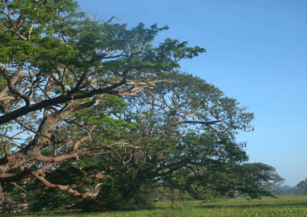 This photo shows the contrast between a large green tree and the clear blue sky.