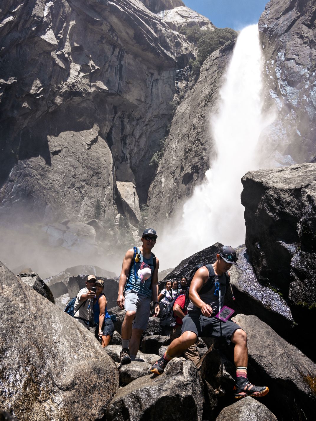 The photo shows the Yosemite Falls and people climbing down from the fall after going to the closest point of view.