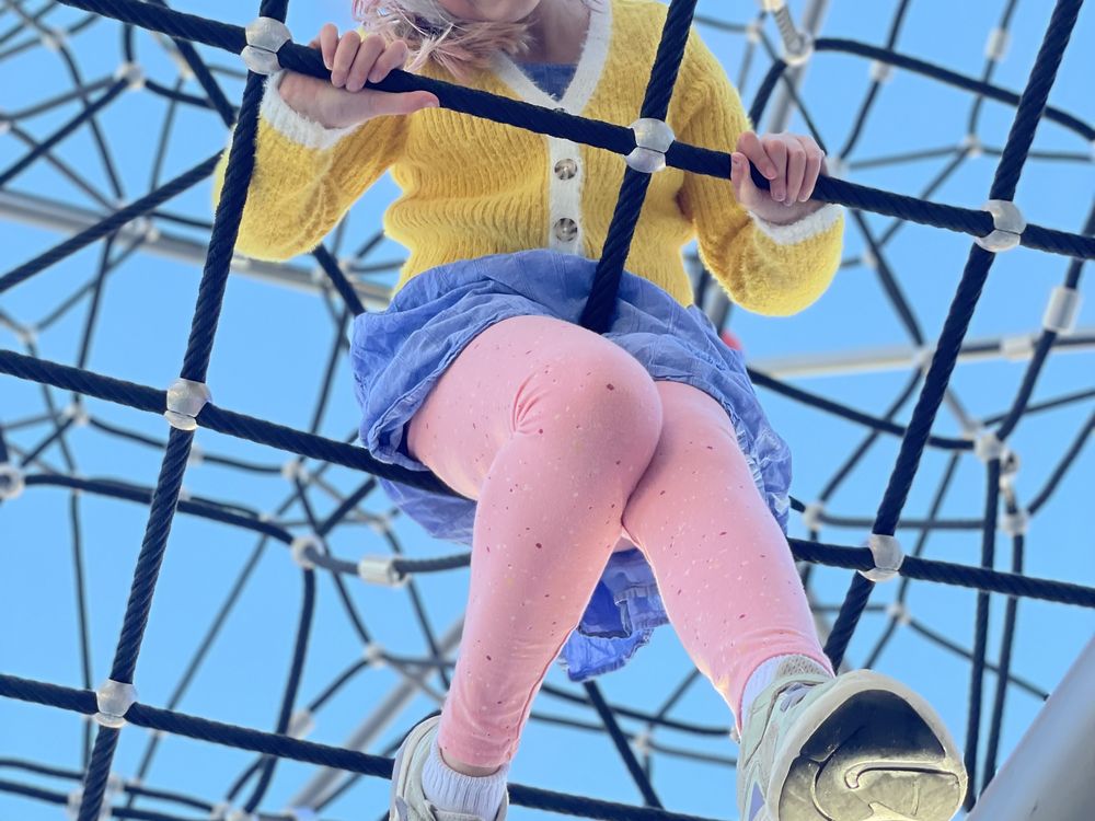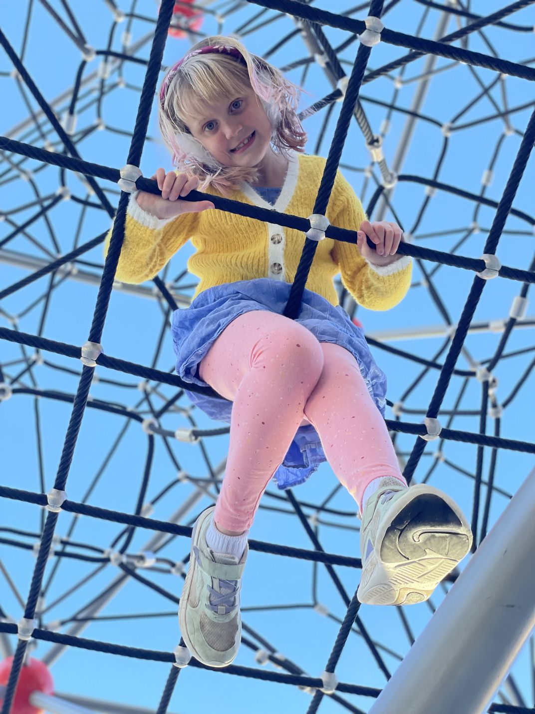 Frances navigates her way to the top of the climbing pyramid at JUMP community center in Boise ID