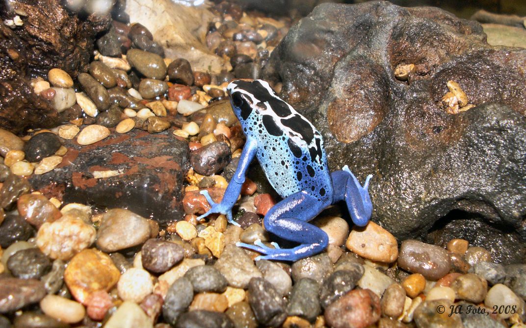 Close up view of a blue frog.