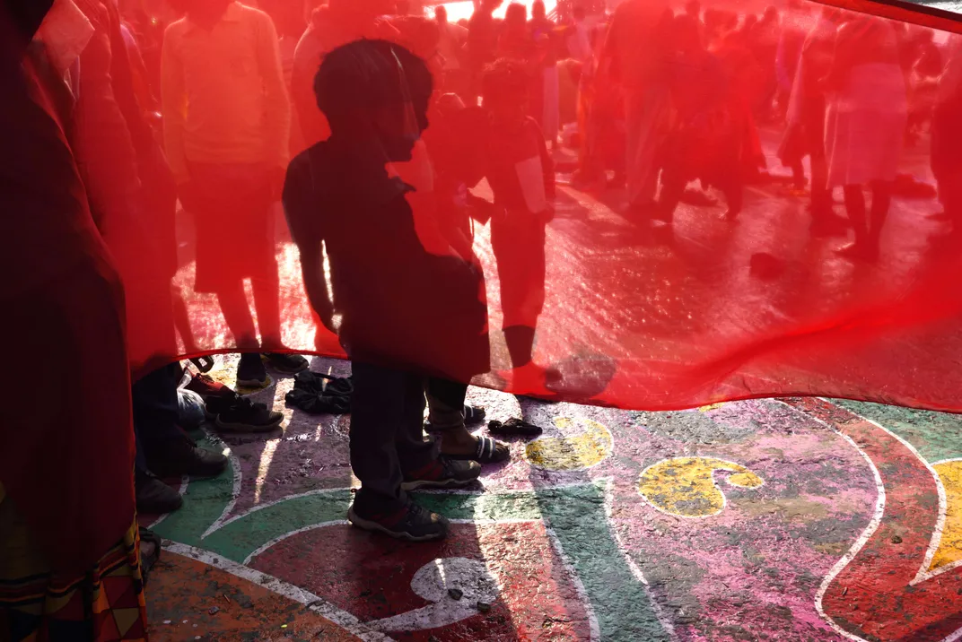 THIS IMAGE IS SHOWING THE PILGRIMS AFTER BATHING IN THE RIVER GANGES, THEY ARE DRYING CLOTHS IN THIS FASION.