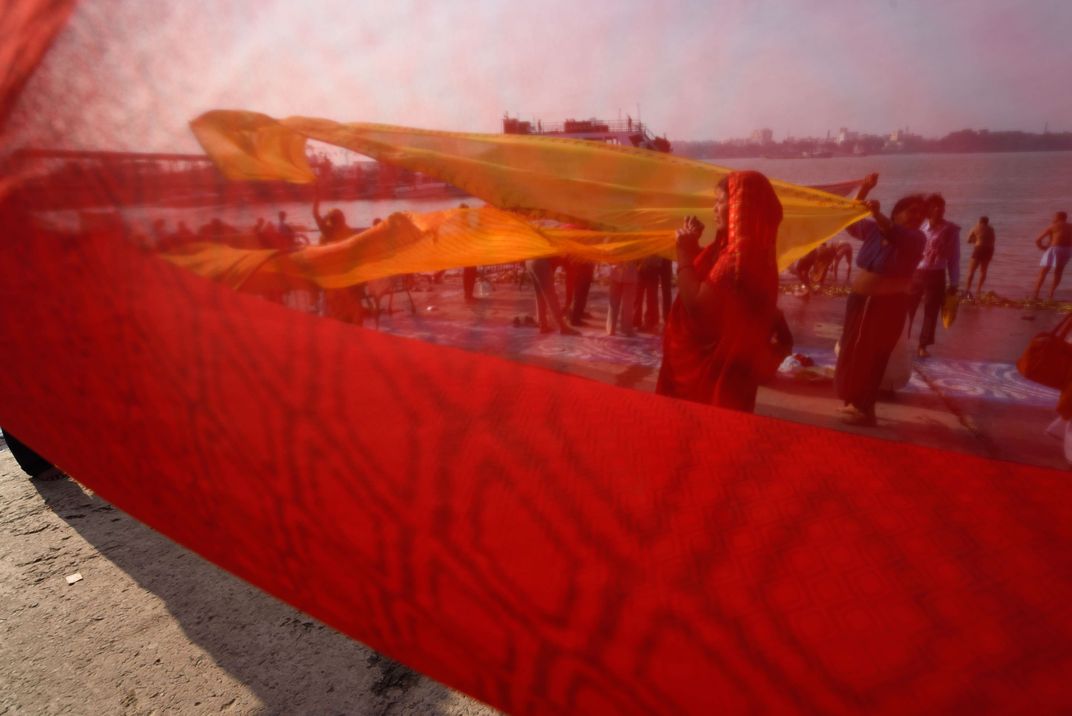 CLOTHS DRYING AFTER BATING IN THE GANGES DURING GANGA SAGAR FAIR HELD EVERY YEAR IN KOLKATA, WEST BENGAL,