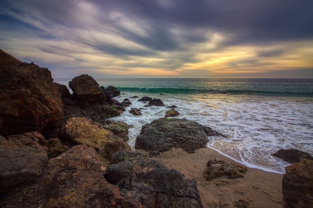 Dramatic sky at sunset along Point Dume State Beach with waves crashing into rock formations along the beach, Malibu, California