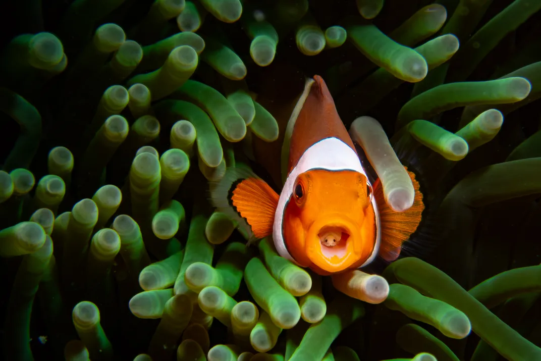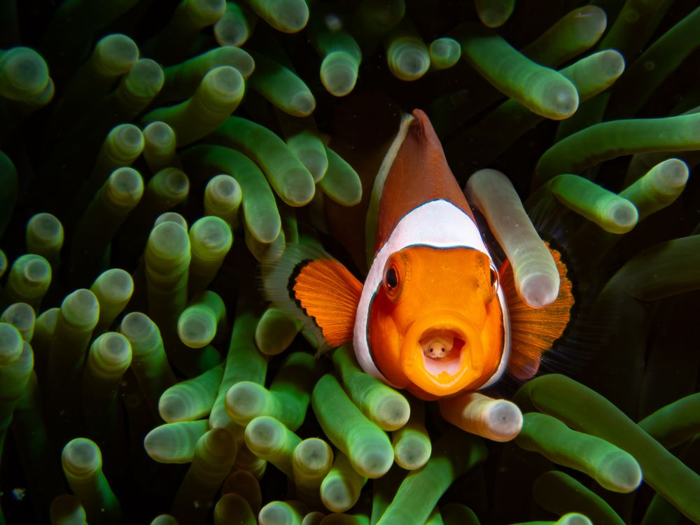 A tiny parasitic isopod peers out from inside the clownfish’s open mouth, clinging to its host as it breathes among the swaying anemone tentacles. This unsettling hitchhiker feeds on the fish’s fluids while remaining perfectly concealed.