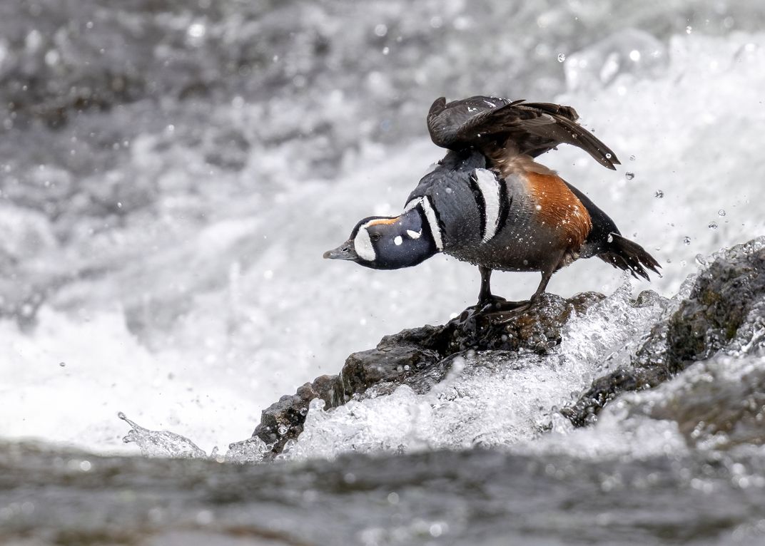 A Harlequin Duck stretches his wings, perched in his favorite spot: right in the middle of white water rapids.