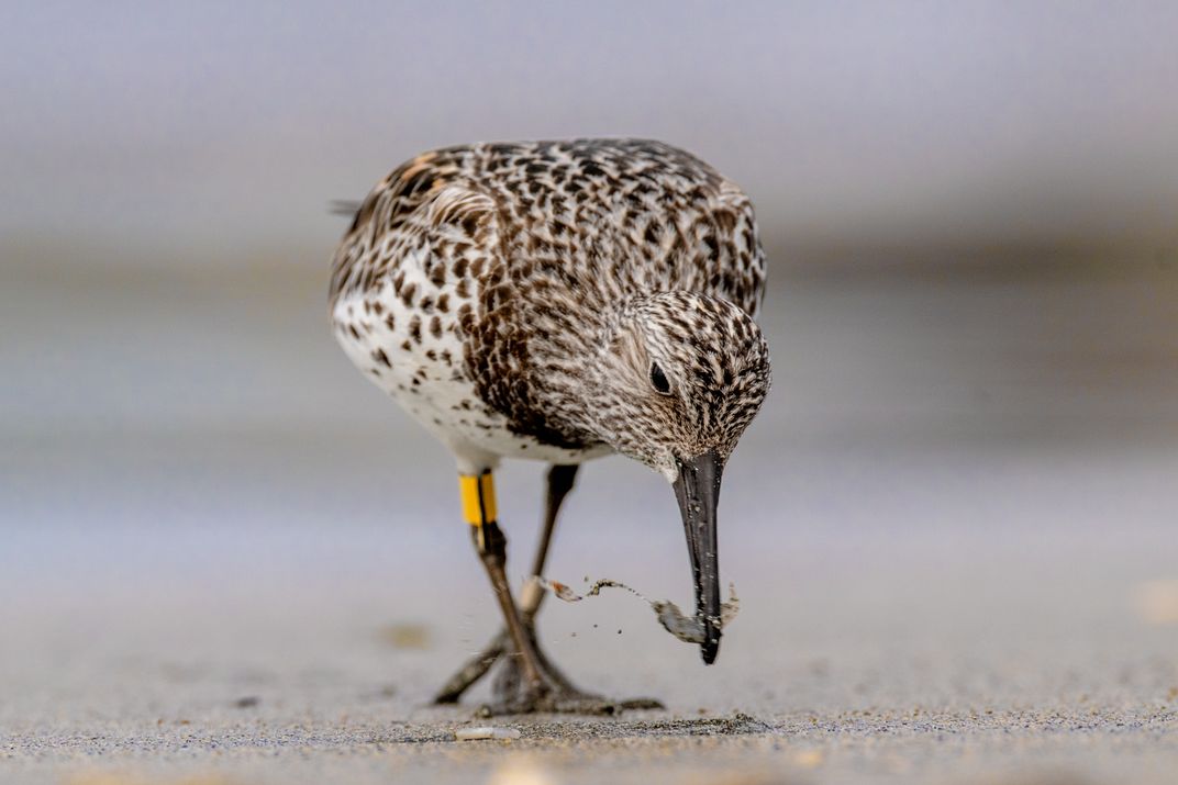 An exceptional close-up of a Great Knot in its strikingly patterned breeding plumage. Photographed at eye level along a tide line at Tho Quang - Da Nang, this magnificent wader is focused on pulling a tiny meal from the sand. The fine detail beautifully showcases the bird's heavily spotted chest and back. Notably, this individual is marked with a bright yellow plastic leg band, identifying it as a subject in an ongoing migratory and population health research project.