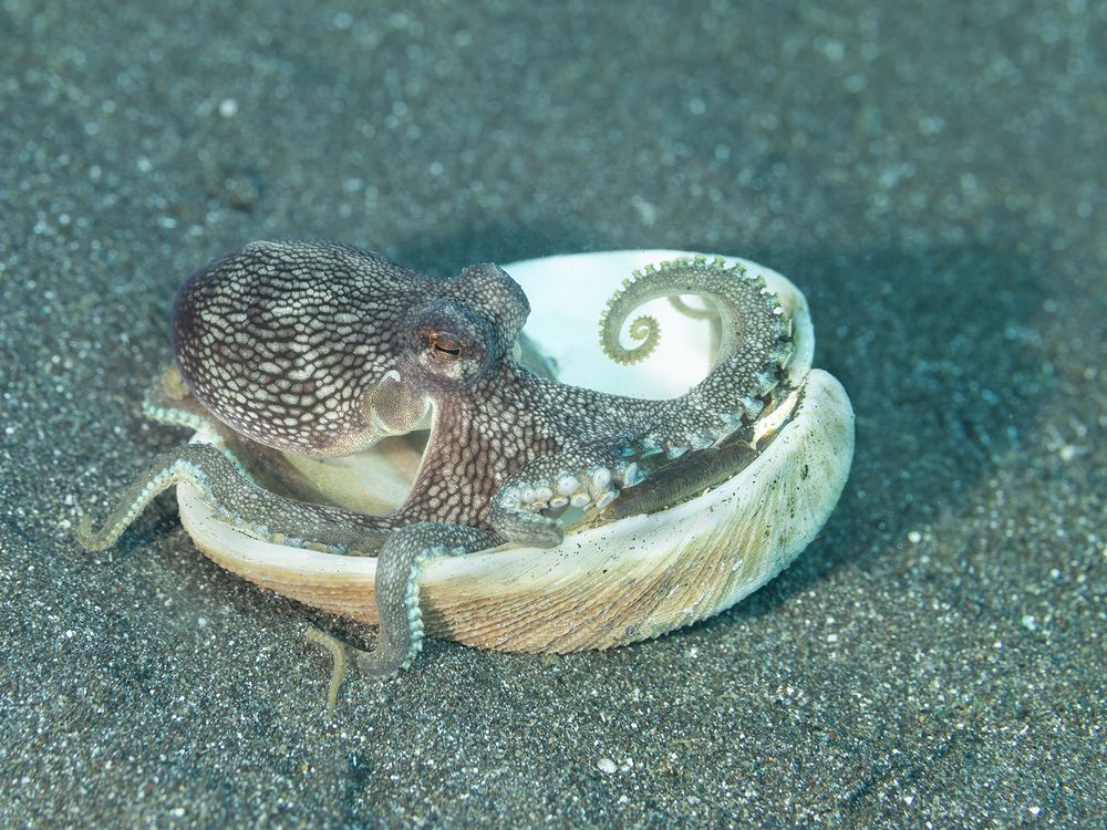 This image depicts a Coconut Octopus taken in Lembeh Strait, Indonesia.