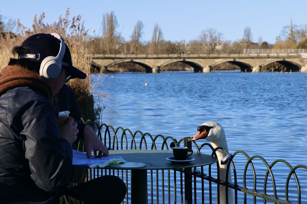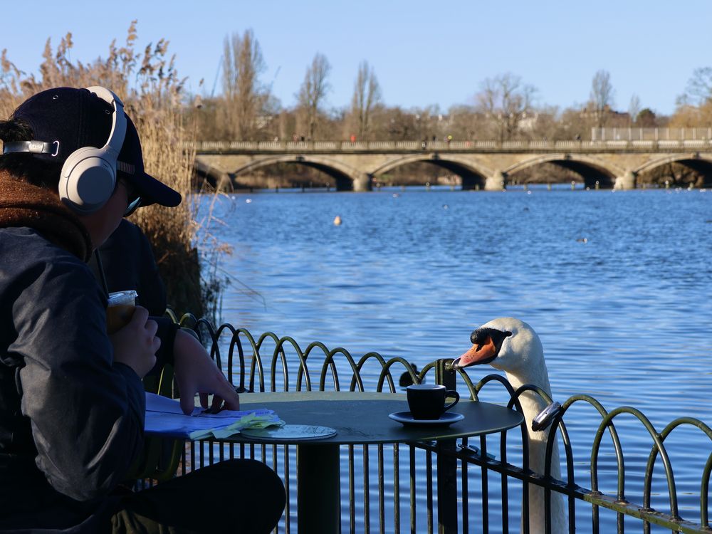 During a stroll through Hyde Park, London, I stopped for a refreshment. The swans also thought it was a good time for a beverage.