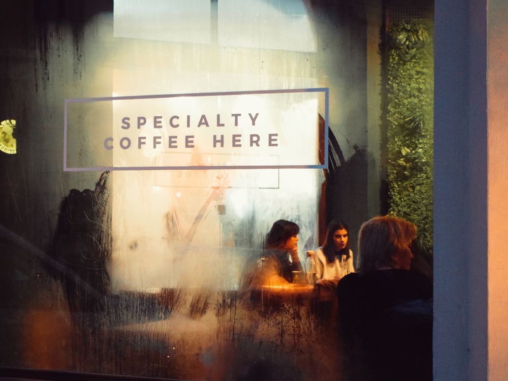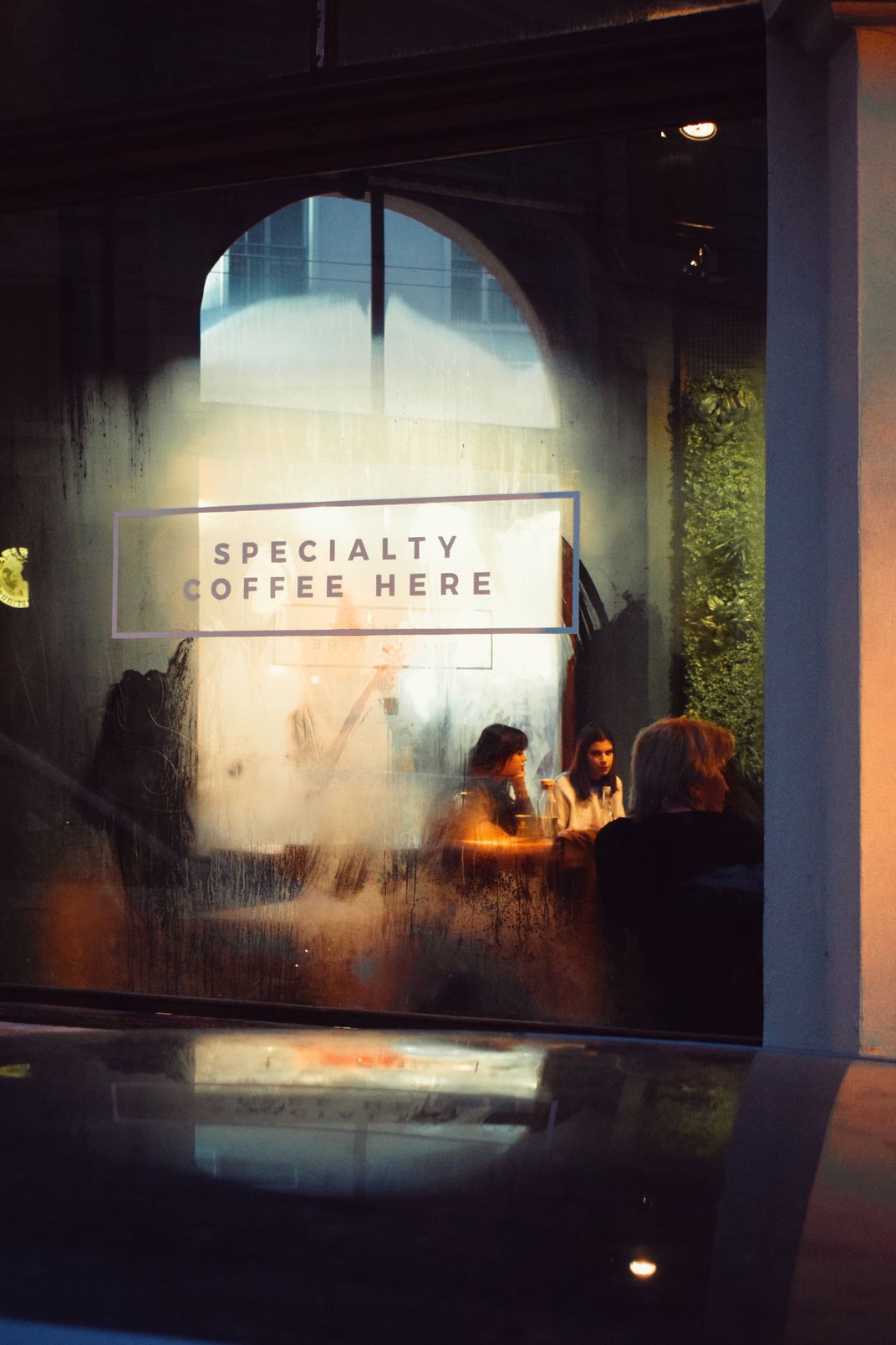 People enjoying a warm cup of coffee on a cold January night in 2019. One of the young ladies in the background spotted me and looked straight into the lens as I was shooting.