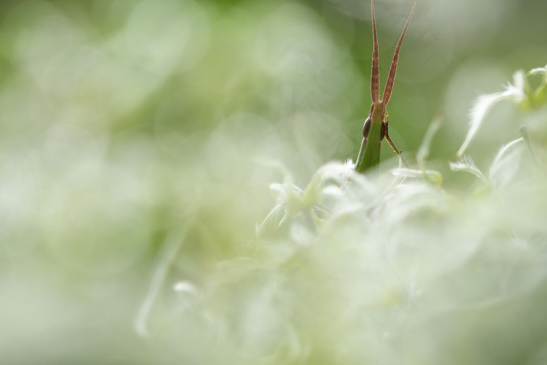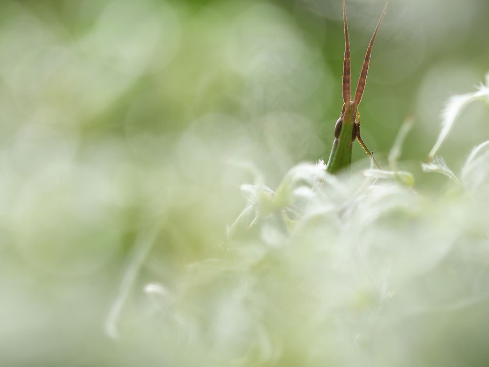 An Acrida ungarica grasshopper pokes its head out among some white seeds.