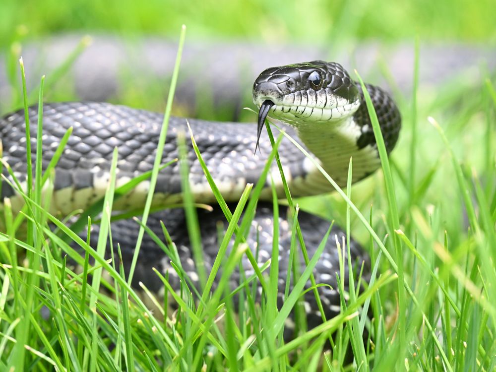 Telepathing a warning message On our longer, three-mile morning dog walks, we loop through a business park with a pond where we often see various waterfowl. Today, there weren’t any particularly exciting birds to photograph, but a Black Rat Snake happened to be warming itself on the paved trail, coiled in a pose that practically begged for a photo. While taking shots, I noticed that the snake was blind on one side. After a quick photo session, the snake began making its getaway, but I reached out and gently touched the tip of its tail. In a flash, the one-eyed snake whipped around, coiled up, and made it perfectly clear who was boss.