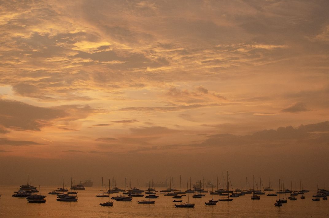 Just after dawn off Colaba, dozens of boats sit motionless on the still Arabian Sea while the sky above them burns gold and orange. The harbour is waking up slowly—engines still quiet, city lights fading—as the first light of day pours through the clouds and turns the moorings into a floating silhouette.
