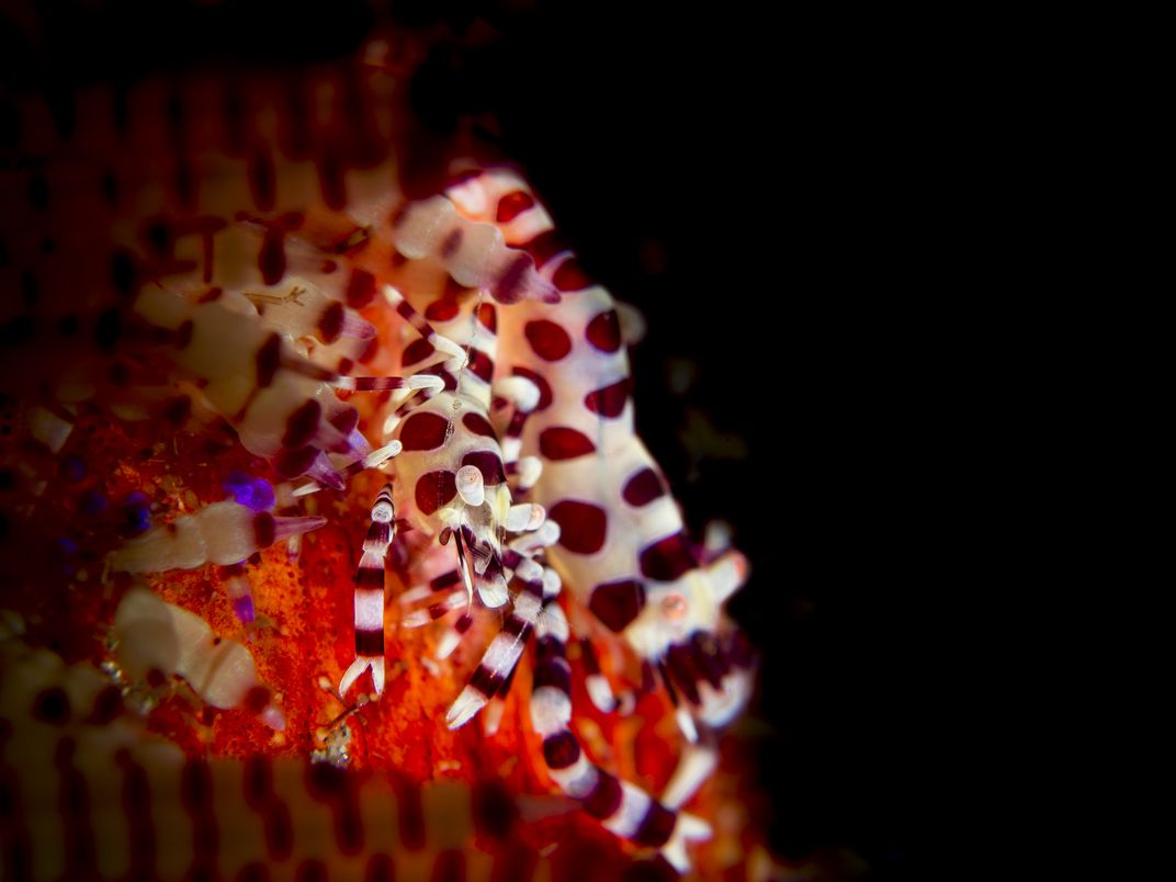 The Coleman's partner shrimp (Periclimenes colemani), also known as the fire urchin shrimp, has striking coloration and patterns. These shrimp often live in pairs. They have chosen the colorful fire urchin as their habitat. From this they cut off some spines to settle there. They feed on the feet of the urchins on which they live.