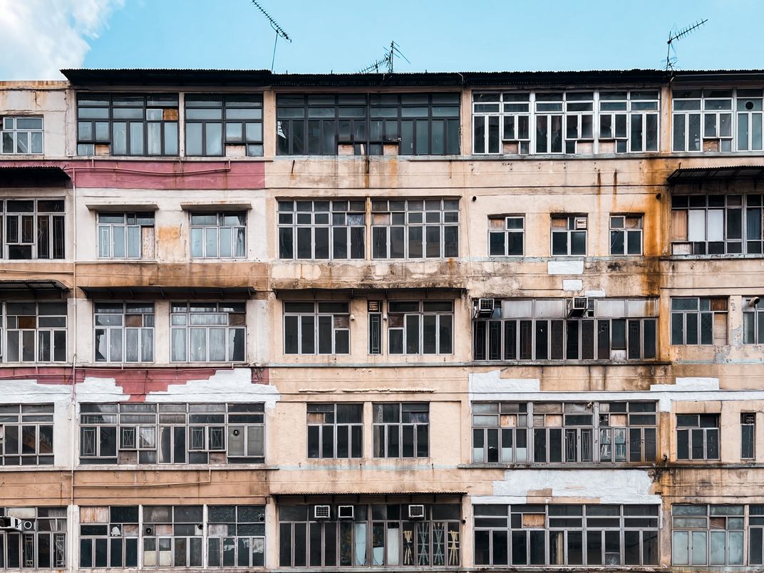 The facade of this building has formed a collage effect through the baptism of time and the self creation of each household.