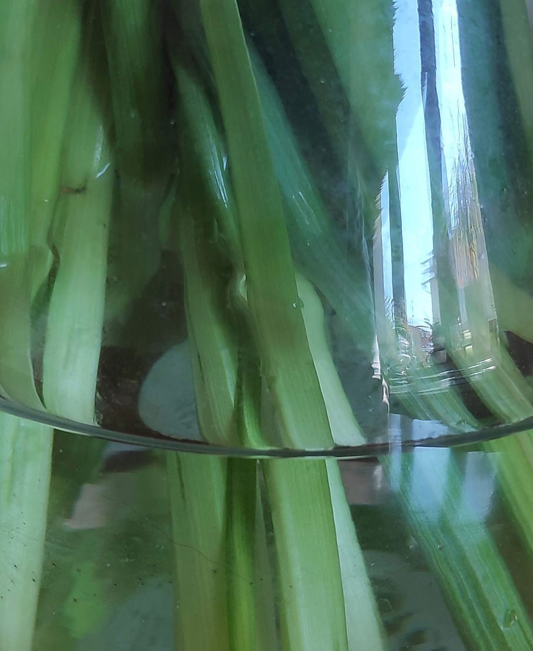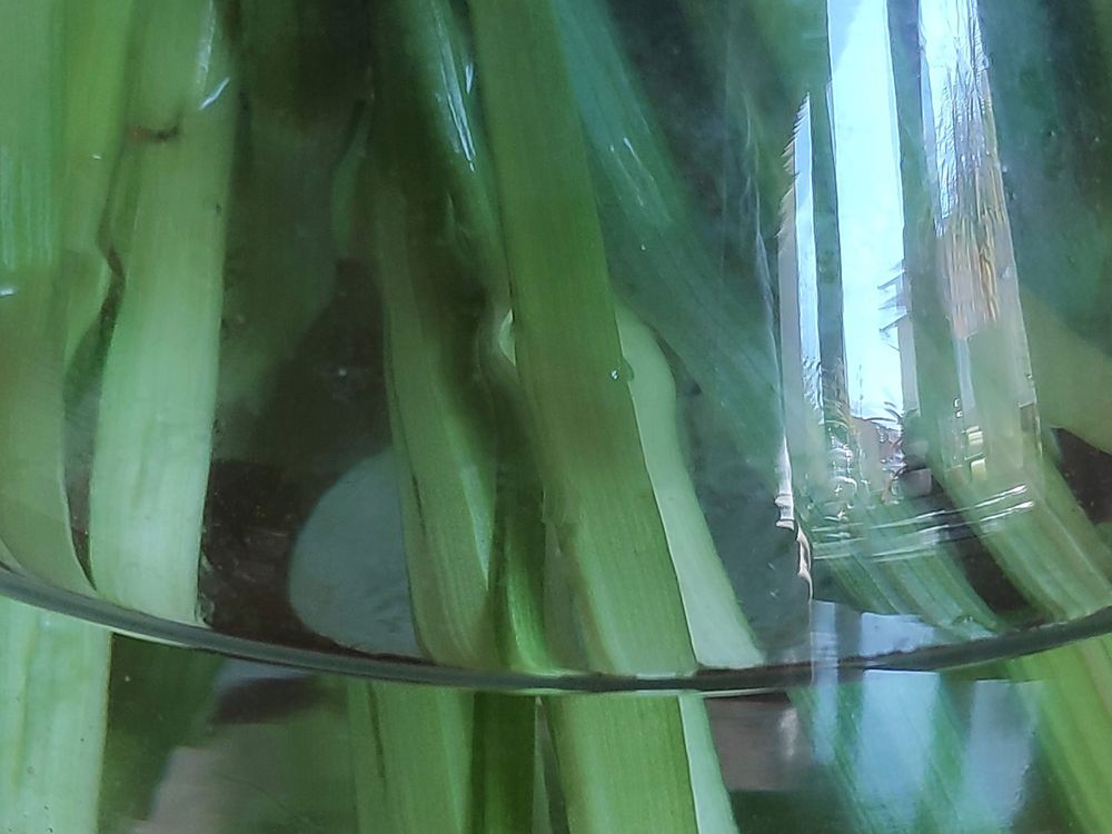 The photo shows the refraction of light in a vase with flowers.