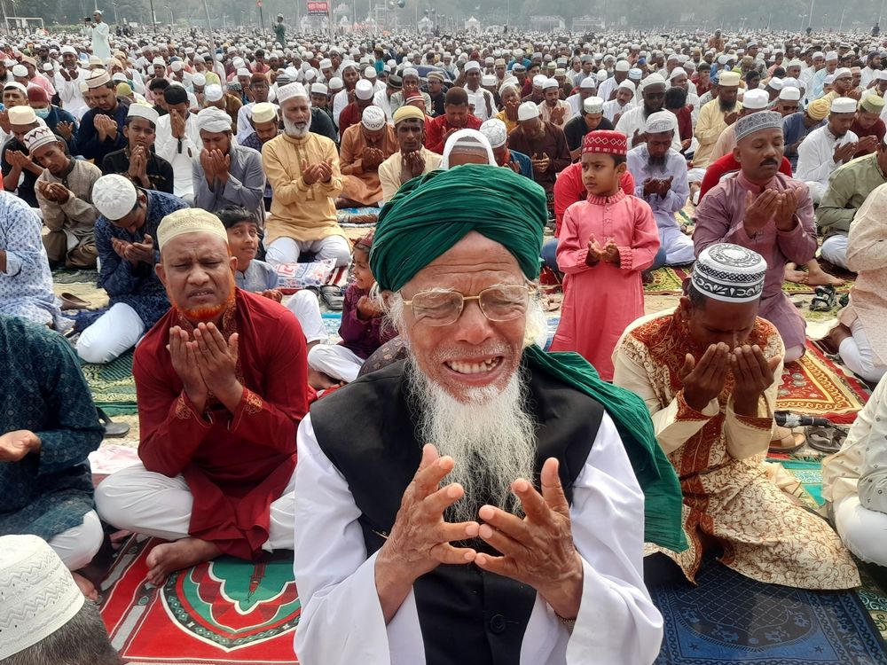 This is an image capturing a moment of collective prayer (Munajat) following an Eid congregation (Eid Jama'at), featuring a large assembly of Muslim worshippers. In the foreground, an elderly religious scholar or Imam, wearing a white robe and a green turban, is seen leading the heartfelt supplication with his hands raised, his face displaying deep reverence and emotion. Hundreds of men, boys, and some children wearing various styles of caps (topi/kufi) are visible in the background, all participating in the same prayer posture. The worshippers are sitting on colorful mats or carpets in an open field, characteristic of large religious gatherings, likely in a South Asian country like Bangladesh. The scene powerfully illustrates a moment of spiritual unity and devotion.