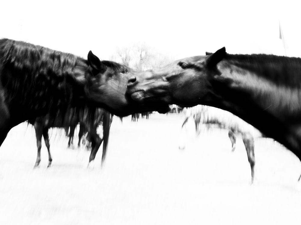 Two horses face to face during a fantasia event in Sidi Bettache , Morocco.