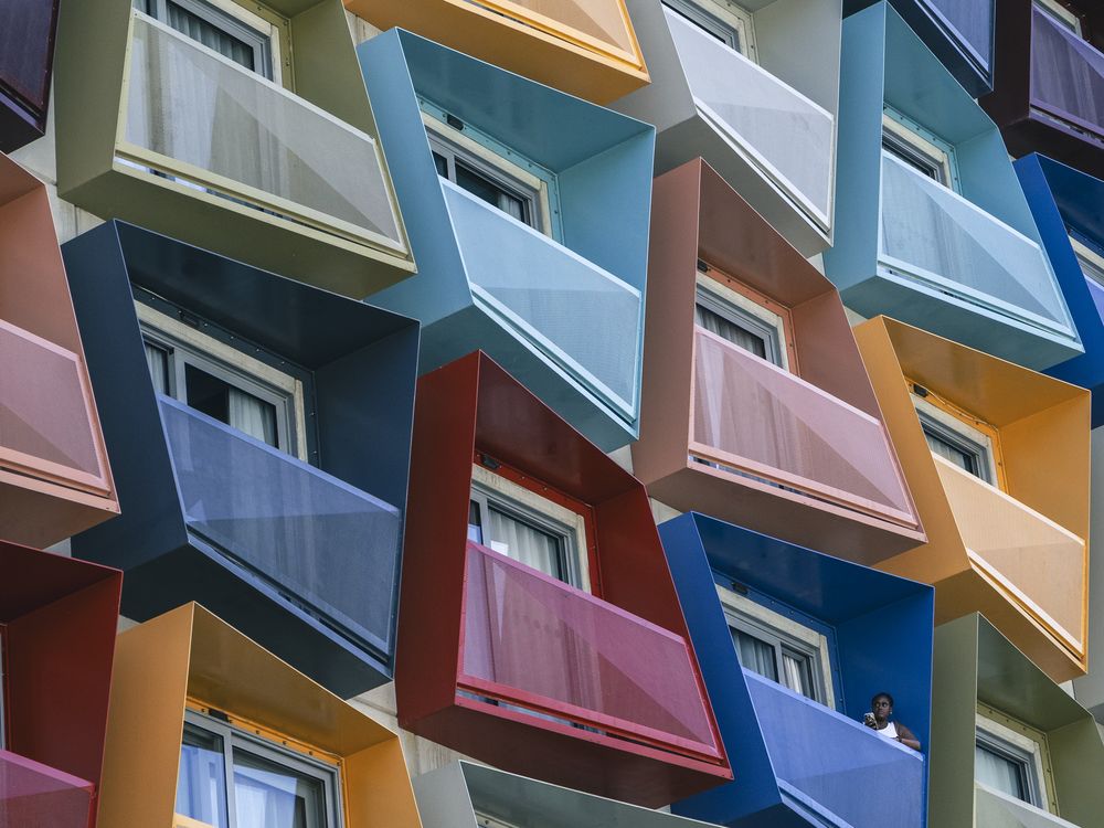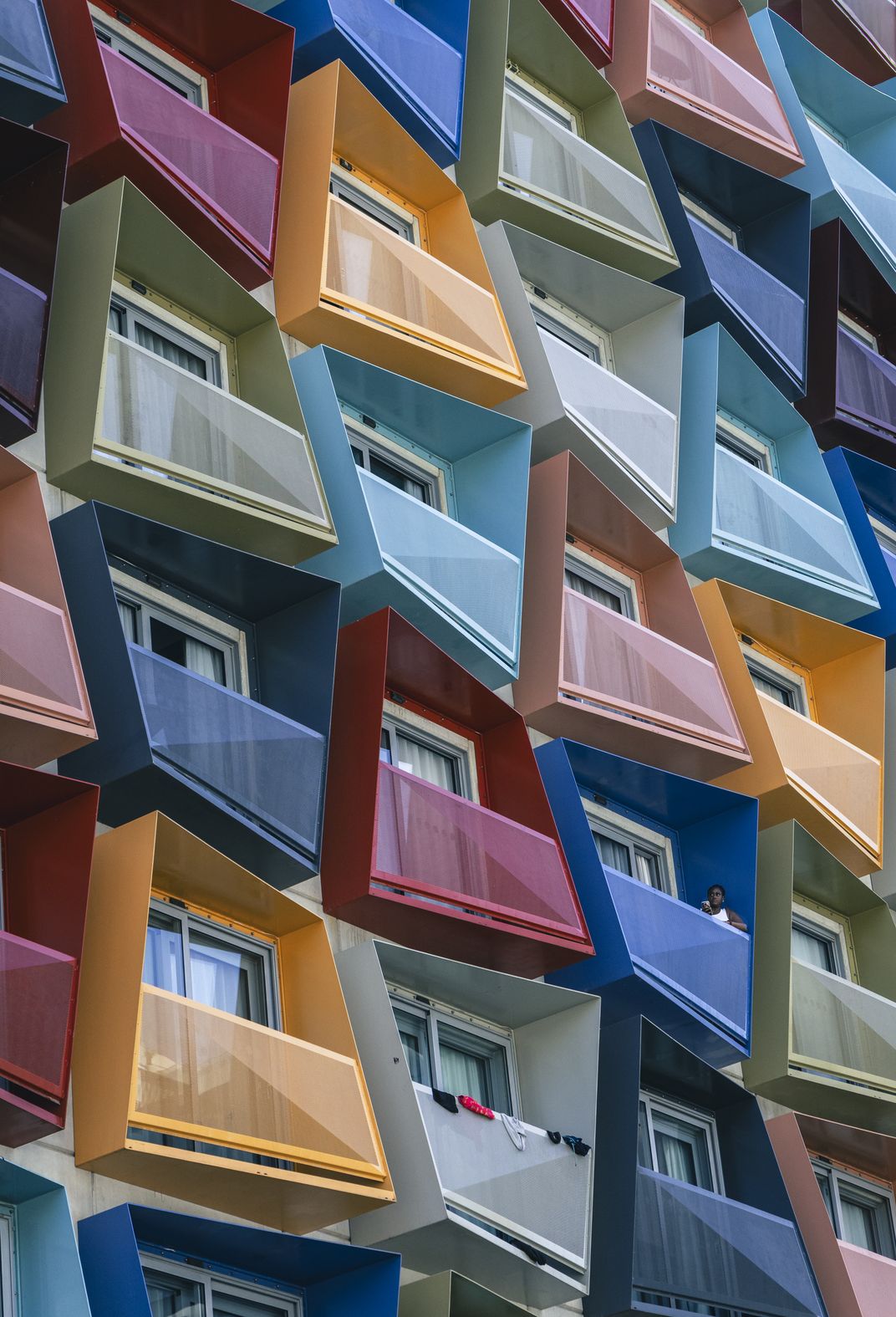 A close-up view of a colorful apartment façade reveals layers of geometric repetition. The tilted balconies create a play of light and shadow that shifts throughout the day, giving each balcony a slightly different mood.