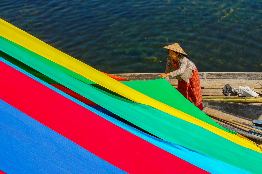 Colorful linen is being made to sew the traditional dresses made the Inle region.