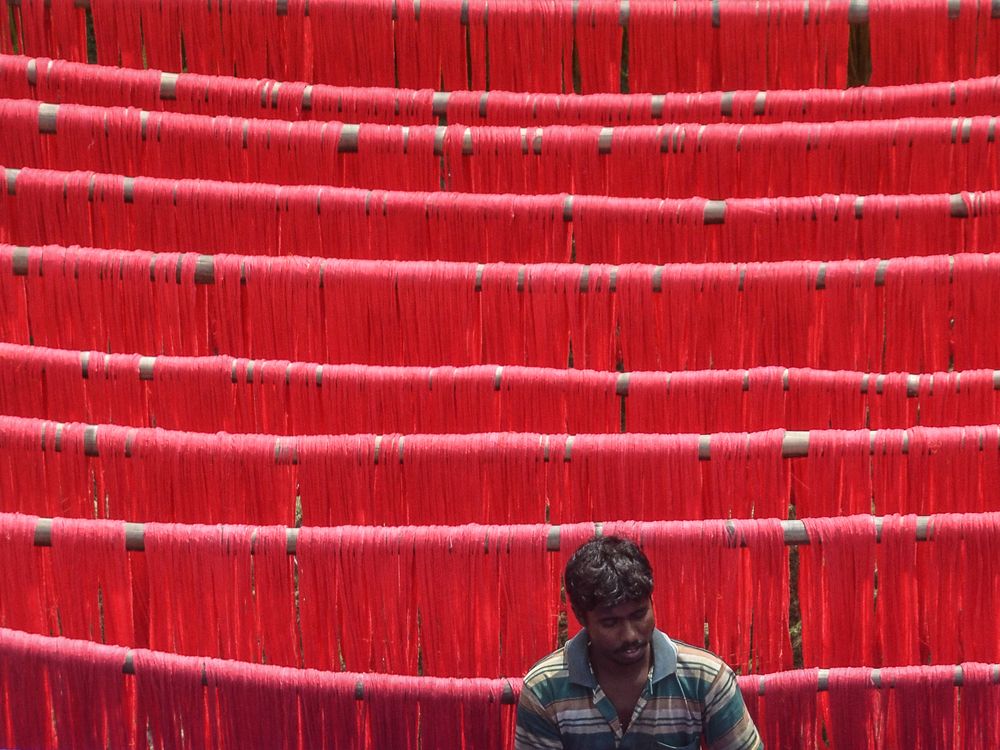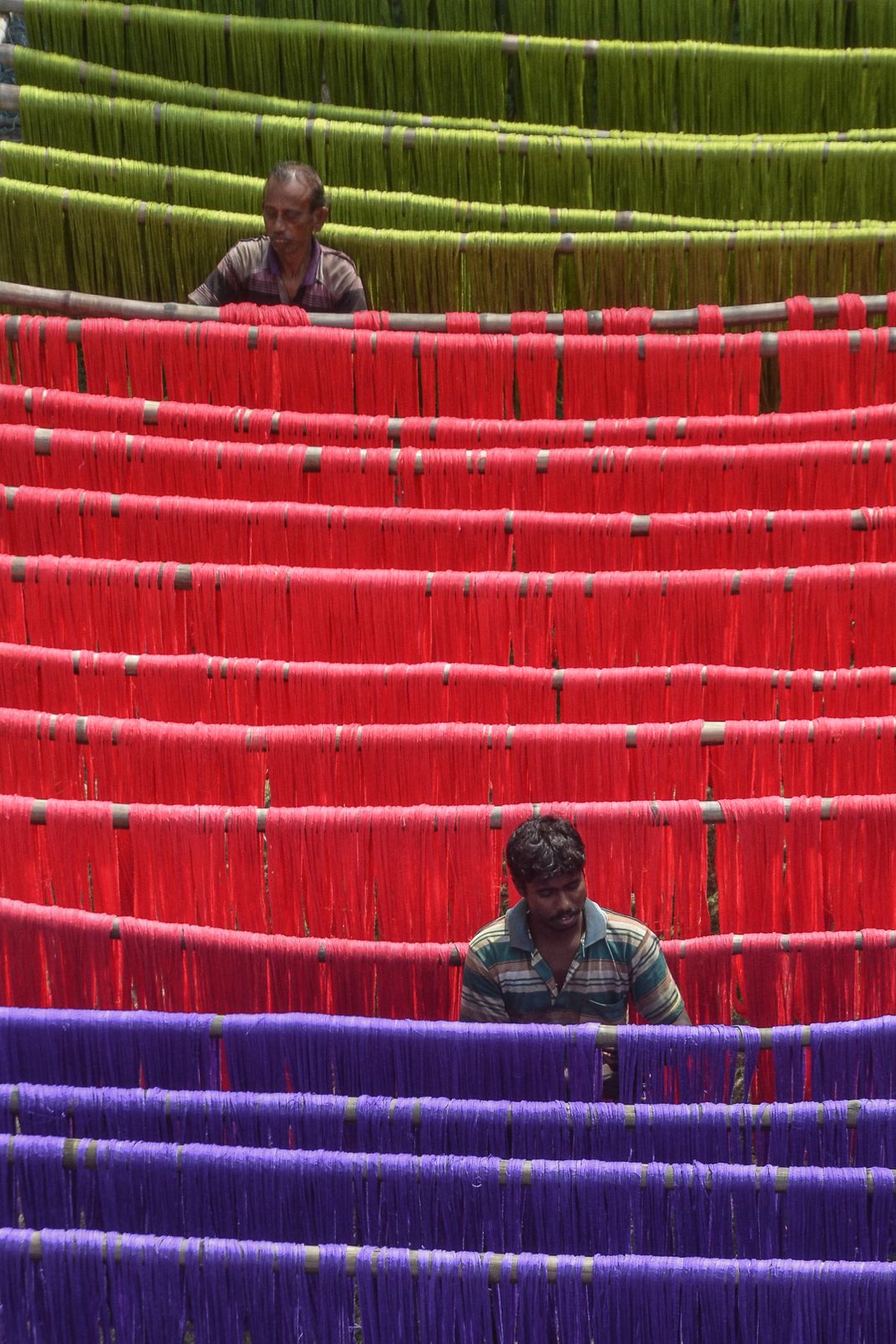 this photo is a vital part of the complete process of making hand-loom clothes. the hand made cotton threads are colored and dried under the sun before it goes under hand-loom. people are ready to take care of the threads all the time. this is a traditional workshop at Nadia, West Bengal.