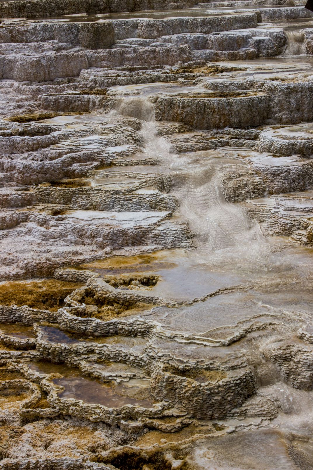 Colorful terraced pools and flowing water photographed in the Minerva Terrace area of Mammoth Hot Springs in Yellowstone National Park.