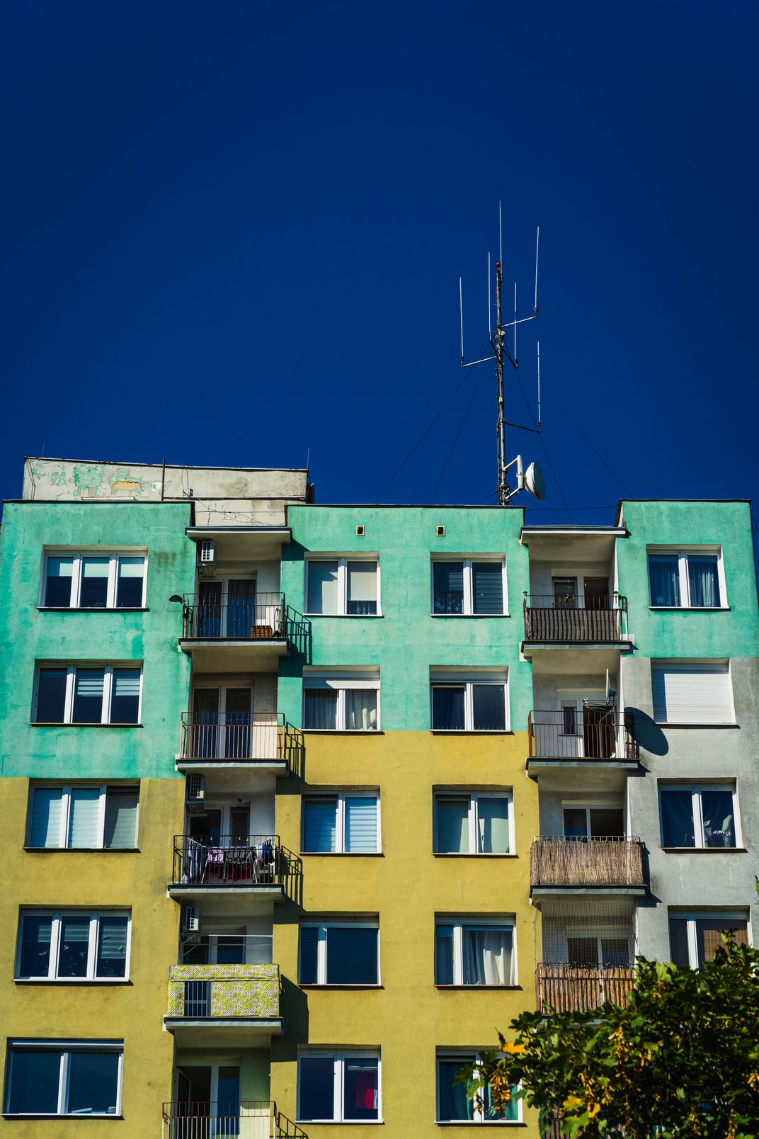 This striking residential building in Zielona Góra showcases Post-Soviet modernism through bold color blocking—vibrant turquoise and yellow facades create a visual rhythm. The regular grid of windows and metal balconies define contemporary urban living in western Poland, reflecting a city's cultural identity through its architecture.