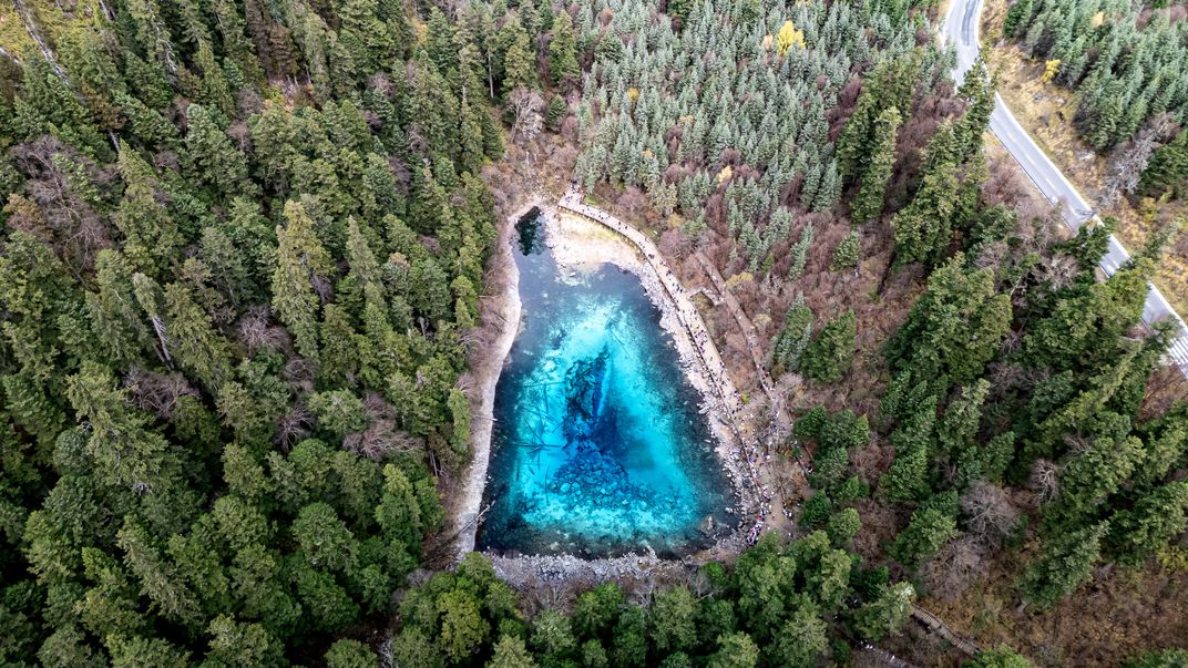 A jade-green forest cradles an icy-blue pool, like a gemstone casually dropped from the sky. Even the walking figures along the shore become scattered glimmers highlighting its brilliance.